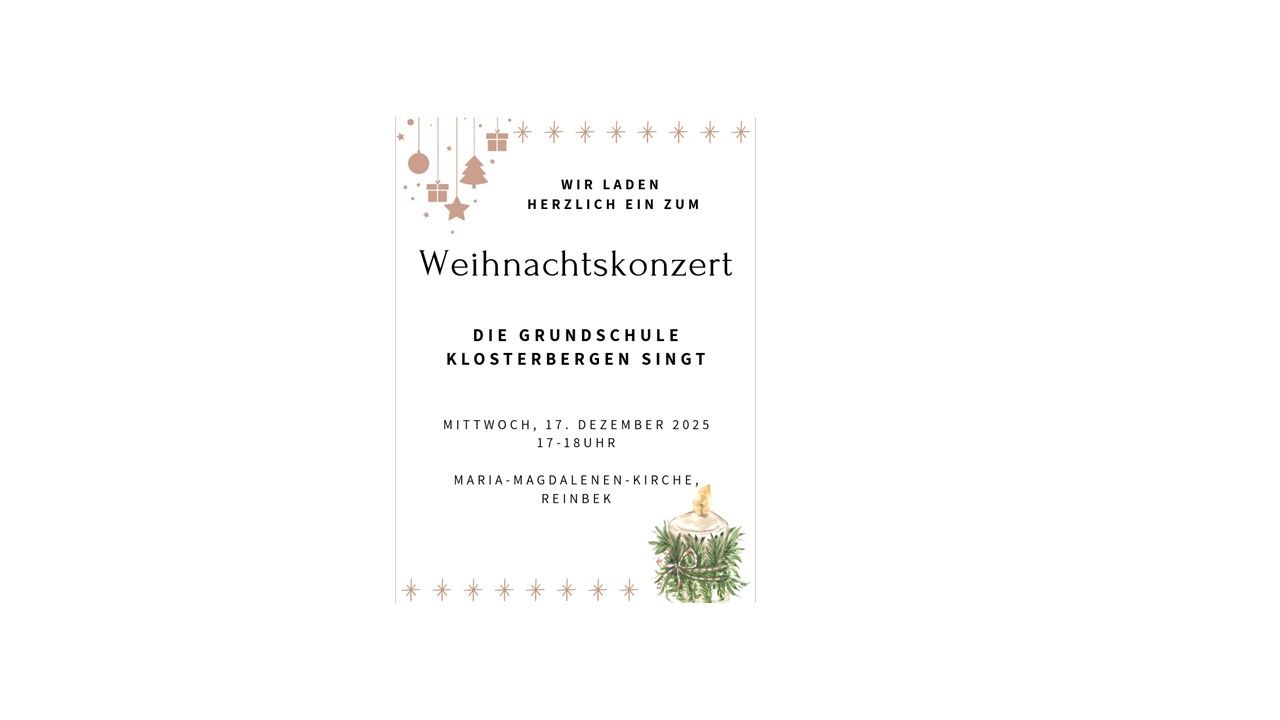 Die Grundschule Klosterbergen singt! Wir möchten Sie ganz herzlich zu unserem Weihnachtskonzert einladen, das an unser Minimusiker-Projekt anschließt. Die Kinder haben in den vergangenen Wochen mit viel Freude und Engagement geprobt und möchten nun zeigen, was sie gelernt haben. Freuen Sie sich auf ein abwechslungsreiches Programm, bei dem unsere Schülerinnen und Schüler unter anderem die Lieder „Es schneit“, „Feliz Navidad“, „O du fröhliche“ und viele weitere weihnachtliche Stücke präsentieren. Die klaren Kinderstimmen, die fröhlichen Melodien und die festliche Stimmung sollen Sie einstimmen auf eine besinnliche und fröhliche Adventszeit. Lassen Sie sich von der Musik verzaubern und genießen Sie gemeinsam mit uns die besondere Atmosphäre, die nur ein Konzert in der Vorweihnachtszeit schaffen kann. Wir freuen uns sehr darauf, Sie in der Maria-Magdalenen-Kirche begrüßen zu dürfen und gemeinsam einen stimmungsvollen Nachmittag zu erleben.